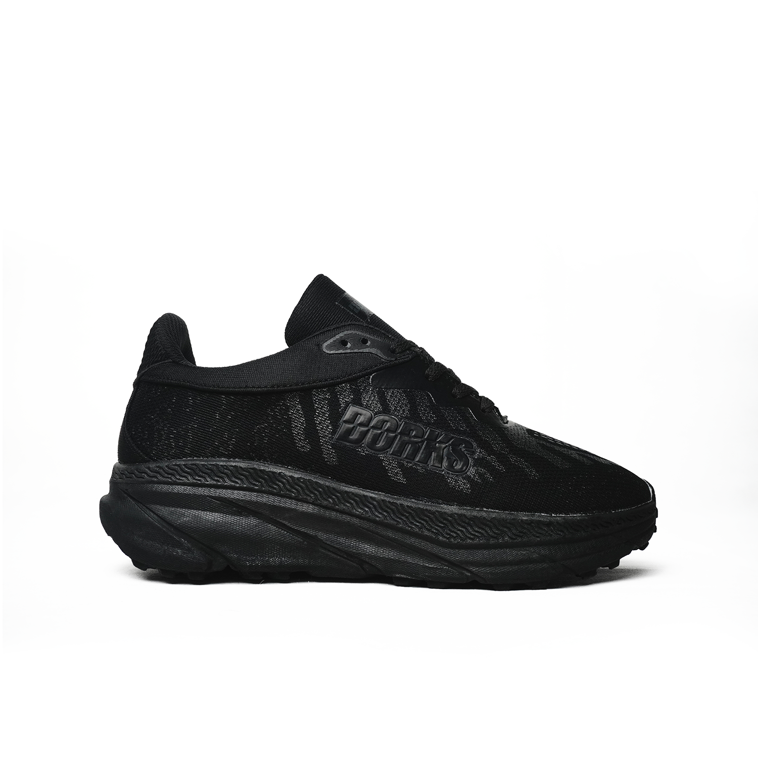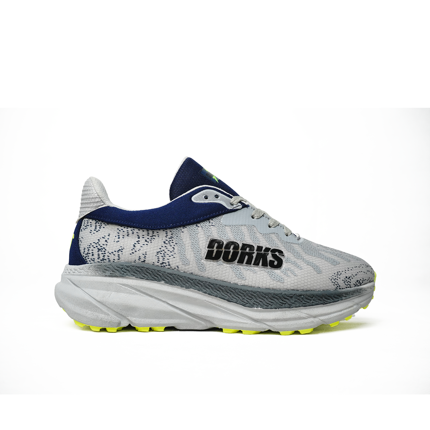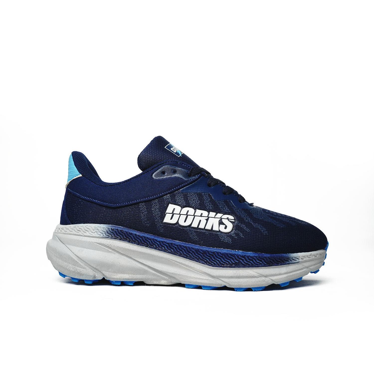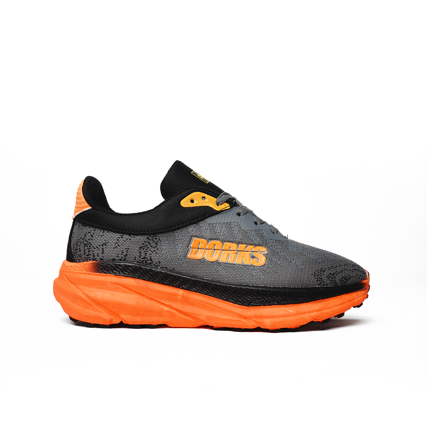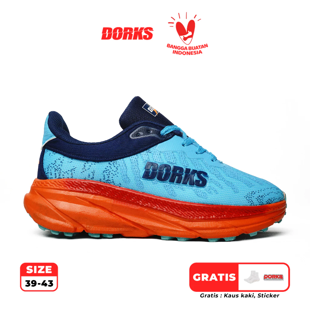 Branding : Tulisan besar “DORKS” berwarna putih dengan bingkai hitam terlihat jelas pada sisi luar bagian tumit sepatu, menjadikannya elemen desain yang tegas.